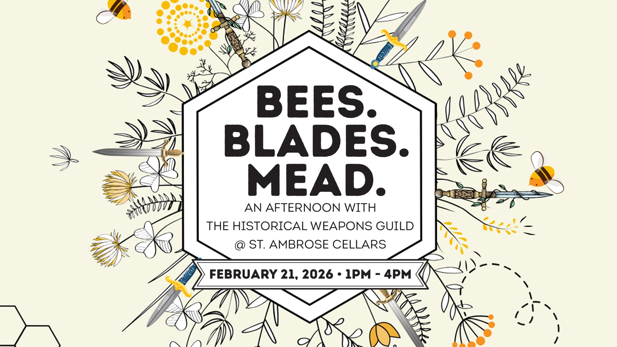 Bees. Blades. Mead. is coming to St. Ambrose Cellars on Saturday, February 21 from 1–4 PM with the Grand Traverse Historical Weapons Guild. This free, come-and-go afternoon will feature a historical weapons “petting zoo,” dagger workshops, live demos, and more. No tickets required — just show up, hang out, and enjoy an afternoon of steel and mead.